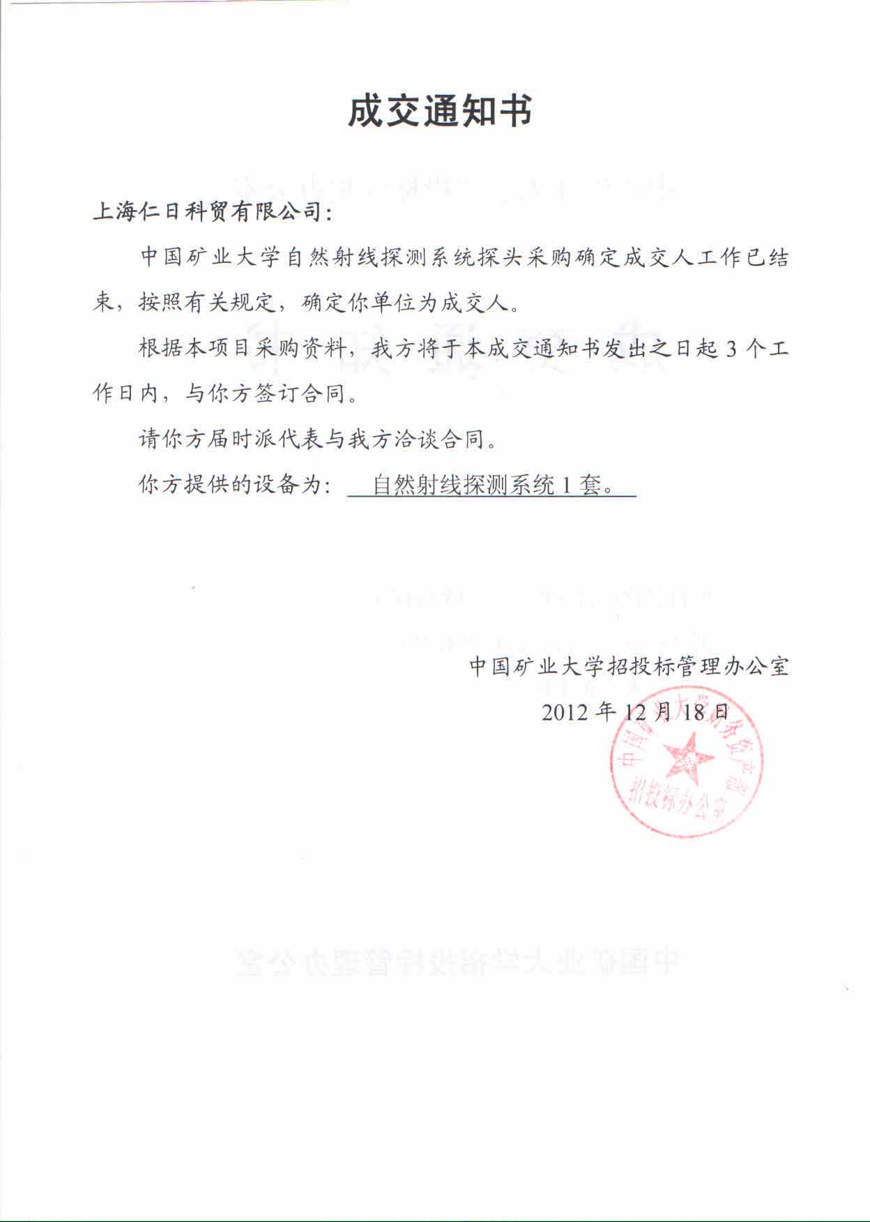 您的位置:首頁>>企業(yè)新聞詳細信息我公司中標中國礦業(yè)大學(射線探頭定制)項目