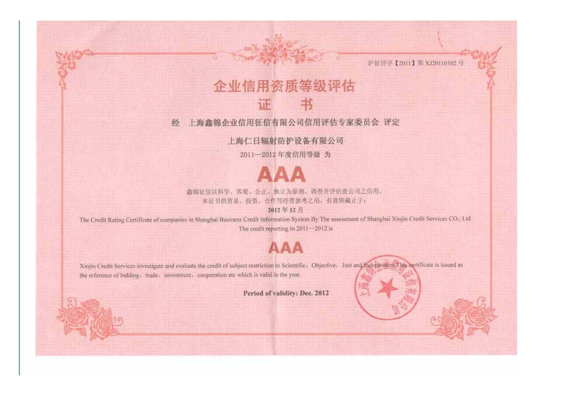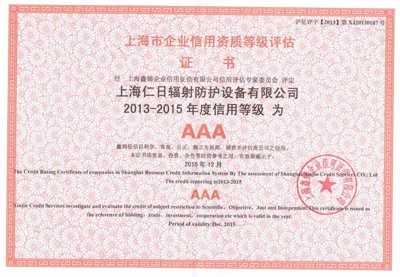 經(jīng)過公司全體同仁多年努力,以熱情服務,誠信待人,用戶滿意為服務目標,以"科技創(chuàng)新、精益求精,用戶滿意、持續(xù)改進"為質(zhì)量方針. 2013年1月經(jīng)鑫錦企業(yè)信用征信有限公司信用評估專家委員會評定,上海仁日輻射防護設備有限公司被評為上海市AAA級企業(yè)信用單位。