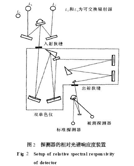 相對(duì)光譜響應(yīng)度測(cè)量用的傳遞標(biāo)準(zhǔn)是非選擇性的腔形熱電堆, 為了保持它的非選擇性, 熱電堆必須在窗口外操作。但由于沒(méi)有窗口, 探測(cè)器隨外界空氣波動(dòng)很靈敏, 它將產(chǎn)生一個(gè)毫瓦級(jí)的等效噪聲功率。為了準(zhǔn)確測(cè)量, 必須提供幾十毫瓦的輻射功率, 該輻射功率對(duì)雙單色儀來(lái)說(shuō)是不能接受的。如果使用單個(gè)單色儀, 則將會(huì)產(chǎn)生大量的雜散輻射, 但不會(huì)影響測(cè)量準(zhǔn)確度, 因?yàn)楸恍?zhǔn)的熱電堆與腔探測(cè)器一樣無(wú)選擇性。