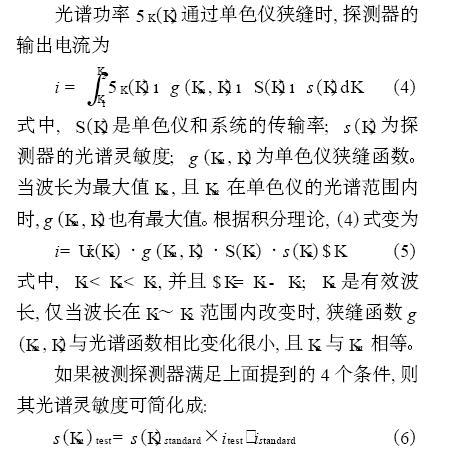 確定校準(zhǔn)燈光譜分布時(shí), 需考慮輻射源的光譜范圍。若將兩個(gè)儀器的光譜直接比較, 則不必考慮光譜選擇儀器的光譜傳輸率。確定被測(cè)燈的光譜分布方法與用已知標(biāo)準(zhǔn)探測(cè)器的光譜響應(yīng)率確定另一未知探測(cè)器的光譜響應(yīng)率相同。